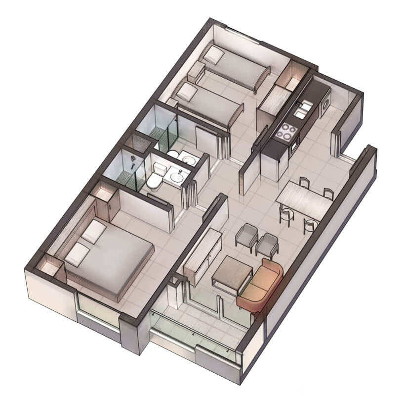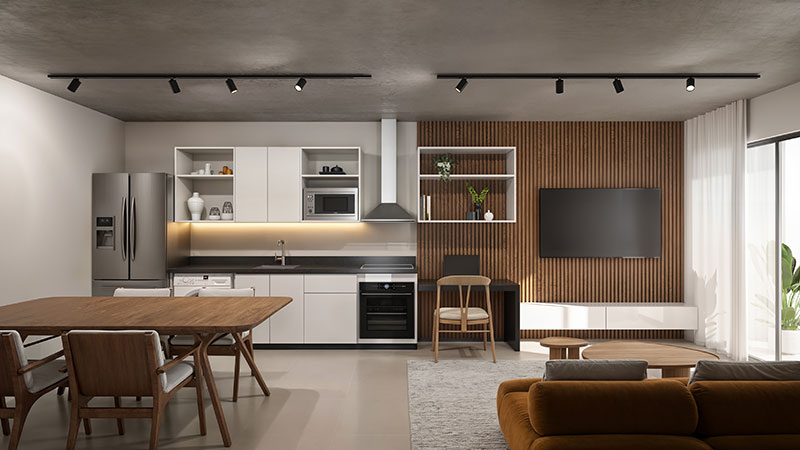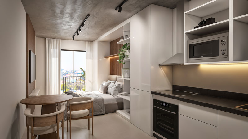 Las plantas del First Element fueron desarrolladas bajo el concepto de departamento optimizado, un modelo que elimina metros subutilizados y prioriza los espacios que el huésped realmente usa.